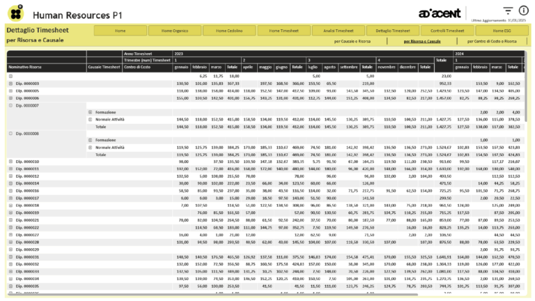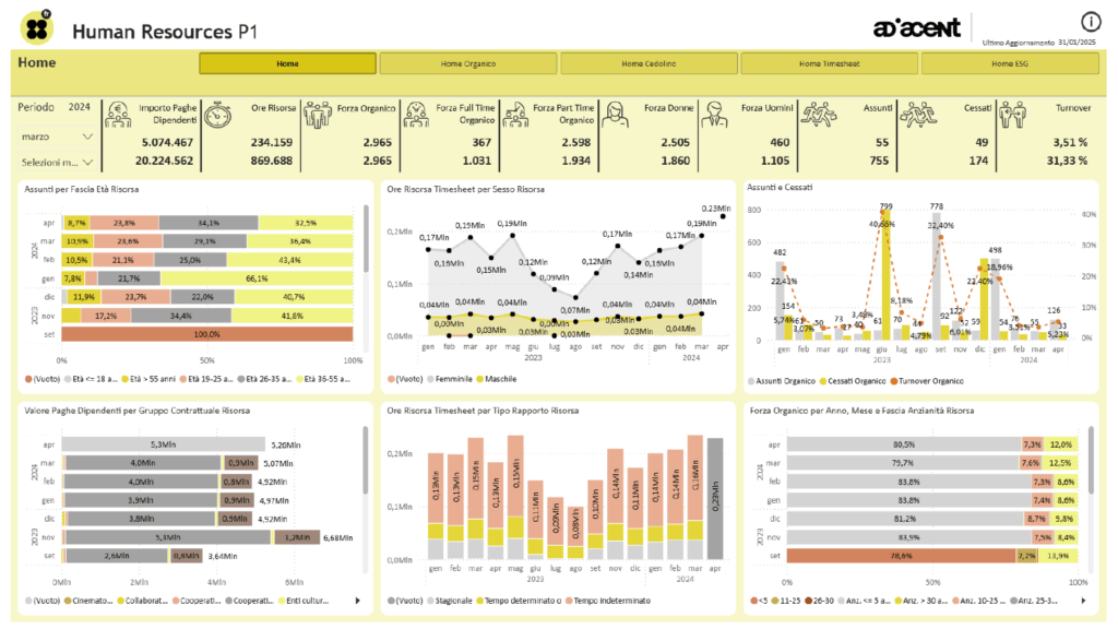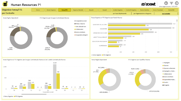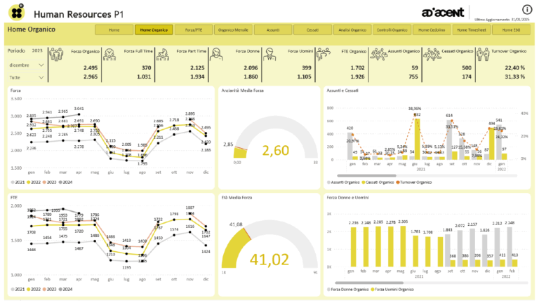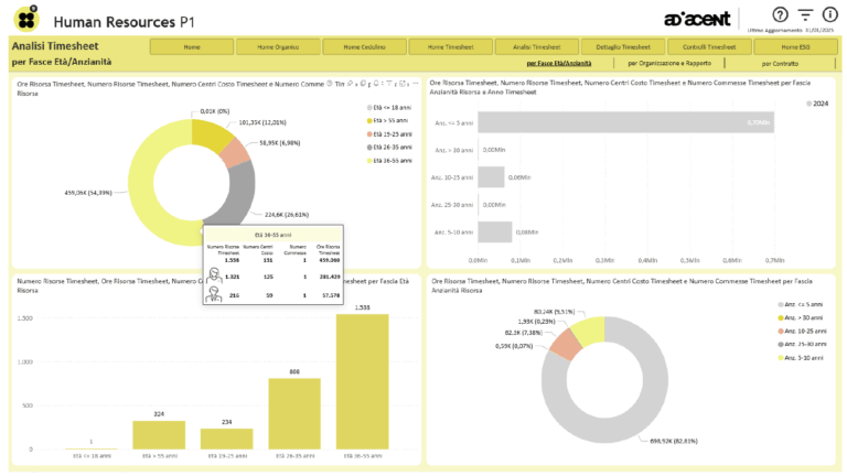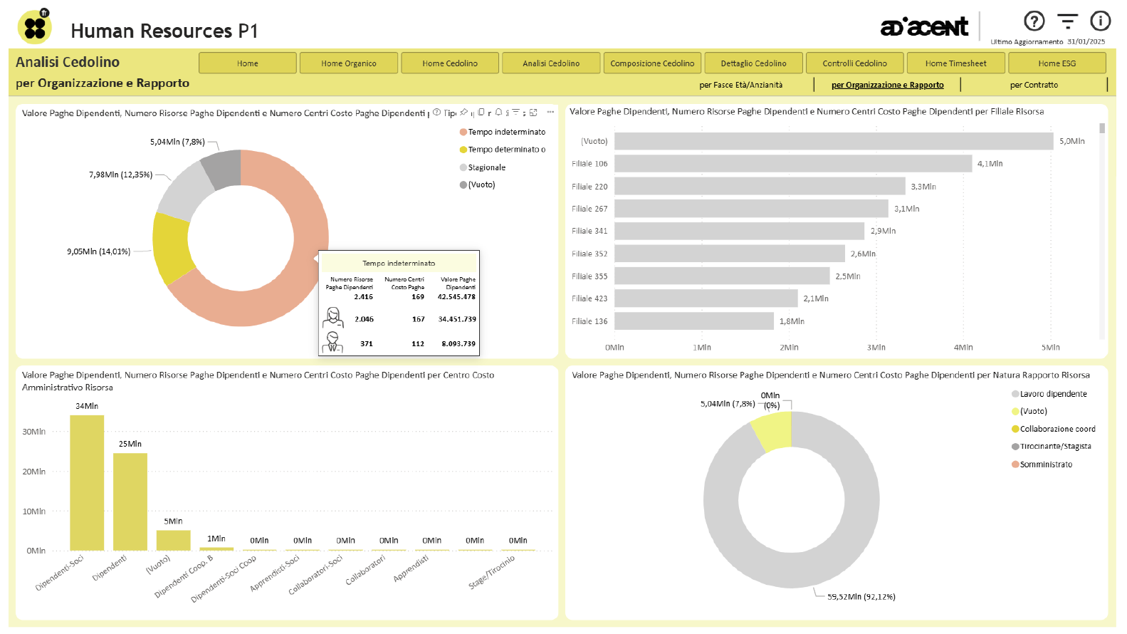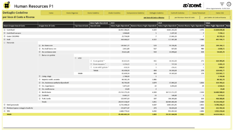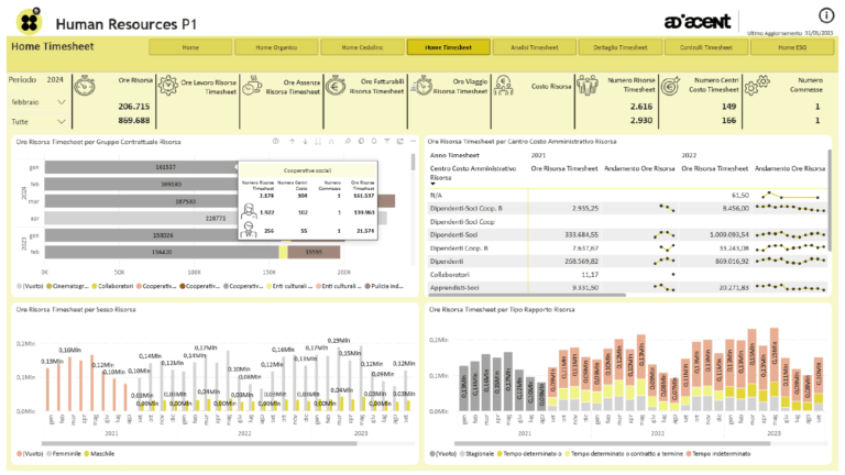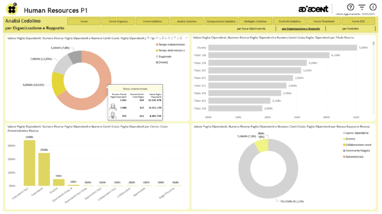 La piattaforma consente di raccogliere, normalizzare e analizzare dati provenienti da fonti diverse (gestionali HR, sistemi di rilevazione presenze, software paghe), restituendo report e dashboard navigabili secondo molteplici dimensioni analitiche.