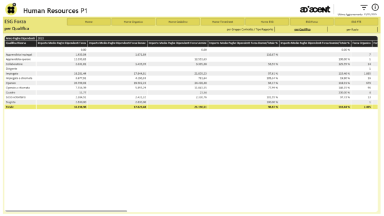 Foreteller consente di esplorare la composizione dell’organico per qualsiasi dimensione rilevante: contratti, genere, seniority, qualifiche, centro di costo, filiale. I dati raccolti permettono di: