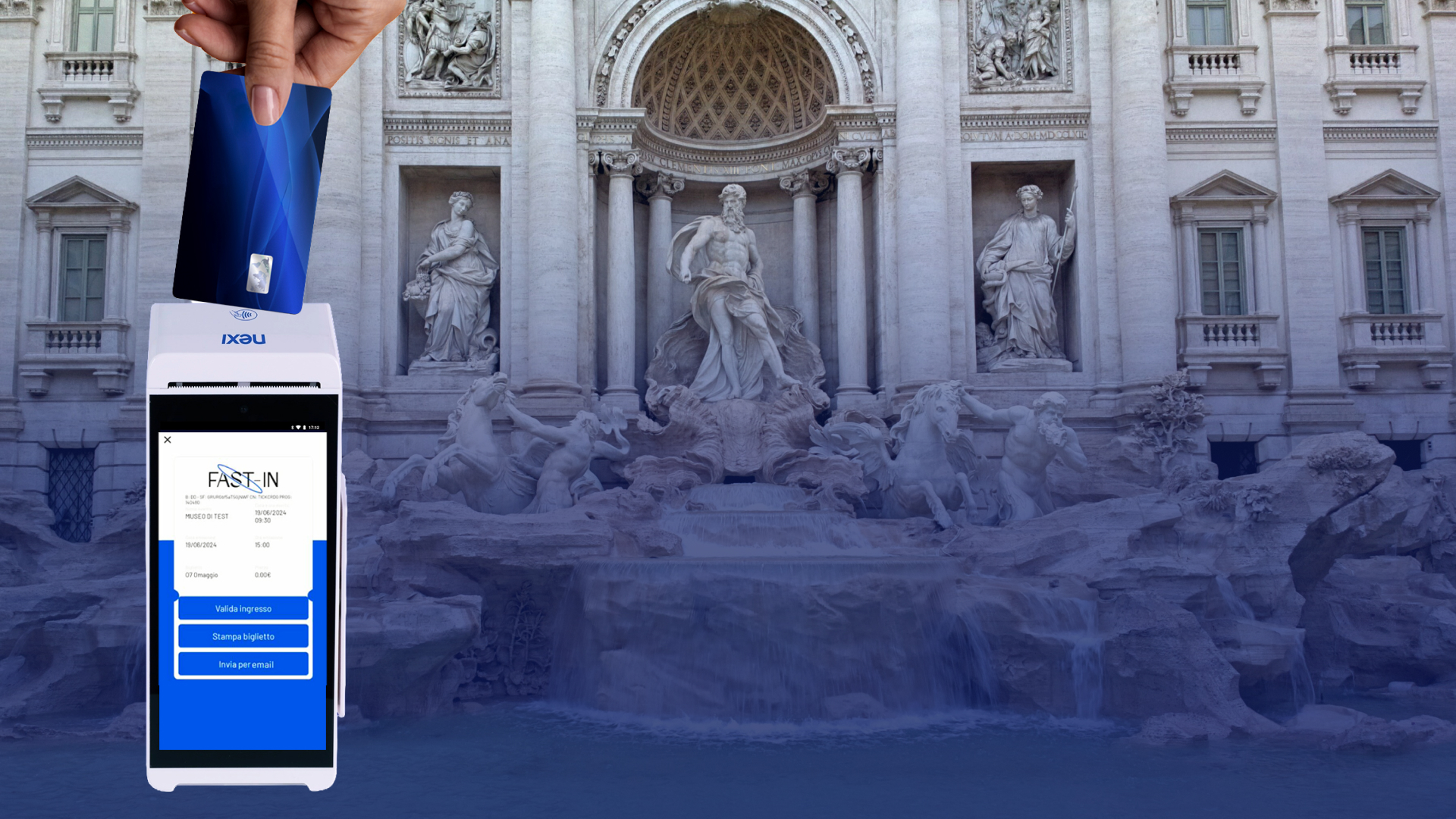 FAST-IN è una piattaforma versatile ed efficiente, integrata con il sistema di pagamento Nexi per rendere la transazione immediata, sicura e completamente cashless. L’App FAST-IN, installata sugli SmartPOS Nexi, trasforma il dispositivo in una vera e propria biglietteria mobile: in circa 8 secondi è possibile gestire pagamento ed emissione del titolo di ingresso, direttamente sul posto.
