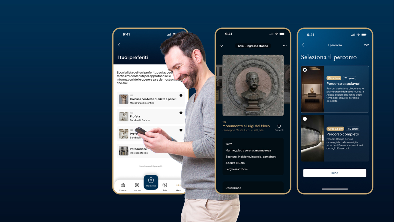 OperaGuide è stata progettata come una guida user-centric, in grado di accompagnare il visitatore lungo il percorso museale offrendo contenuti contestualizzati sulle opere e sugli spazi, aiutando a comprenderne il significato, le relazioni e la collocazione originaria. L’App consente di esplorare il Museo secondo il proprio ritmo e attraverso due percorsi da selezionare tramite l’App: il percorso completo per conoscere le opere presenti nel Museo (2h e 15 minuti di durata per circa per 225 opere) o il percorso breve “Per Sommi Capi” per una visita più rapida ma sempre esaustiva (1h circa di visita per 26 opere).